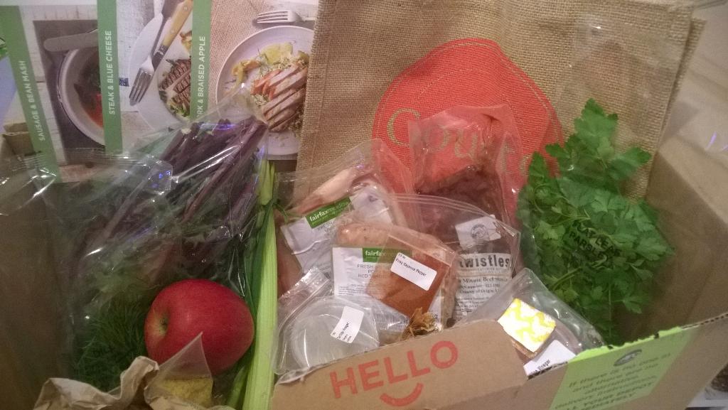 Everything was packaged nicely in the printed box. I must admit I was intrigued as to how it would be packaged with such a variety of ingredients! 95% of the packing is recyclable and from renewable resources which I think is a great thing for companies these days, the meat and cheese was kept cold with a couple of large ice packs and everything protected by a bag of wool which also helped with keeping it all cool. The box was in to compartments which stopped the vegetables and fruit from getting bruised. The only slight problems we had were that the spring onion looked a little limp and the vinegars had very slightly leaked from their pots and bags, but to be honest I wouldn't know a better way to package these.